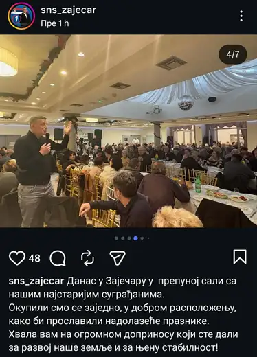 "Danas u Zaječaru u prepunoj sali sa našim najstarijim sugrađanima. Okupili smo se zajedno, u dobrom raspoloženju, kako bi proslavili nadolazeće praznike. Hvala vam na ogromnom doprinosu koji ste dali za razvoj naše zemlje i za njenu stabilnost", napisali su uz fotografije sa proslave.
