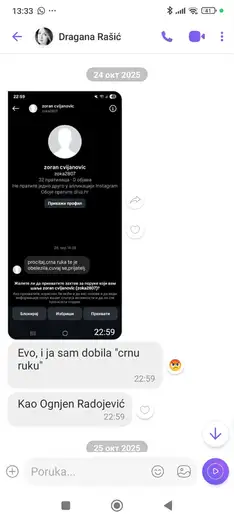 "I da još jednom ponovim još jednu jako bitnu stvar, a to je da ovo nije jedina pretnja. Nije sa ovog istog profila, kasnije je meni takođe upućena pretnja, već sa drugog Instagram profila koji je takođe pretio još nekim, kako kažemo, javno istaknutim ljudima u kontekstu opozicionog rada. To je profil koji nosi naziv 'Zoran Cvijanović', gde mi se takođe uputila pretnja u kontekstu da pazim šta radim. Ja tu prijavu tada u tom trenutku nisam prijavila nadležnim organima zato što sam shvatila da kada sam prijavila ovo Policijskoj upravi Ruma, Policijskoj stanici Ruma, ovakva jedna situacija i moj uopšte društveni položaj bi trebalo da označava jedno hitno reagovanje koje se nije desilo. Pa iz tog razloga sam zaključila, da je potpuni nonsens da sada prijavljujem i taj sadržaj te neke druge poruke sa nekog drugog profila koja mi je stigla privatno u inbox na Instagramu. Jer, kao što vidimo, tužilaštvo i policija ne reaguju, odnosno reaguju sa zakašnjenjem od sedam meseci, što znači, da je stvarno neko imao nameru da me liši života, do sada bi se već sto puta okrenula u grobu i verovatno bi od mene ostao samo prah i pepeo", kaže poslanica Dragana Rašić za Glas Zaječara.
