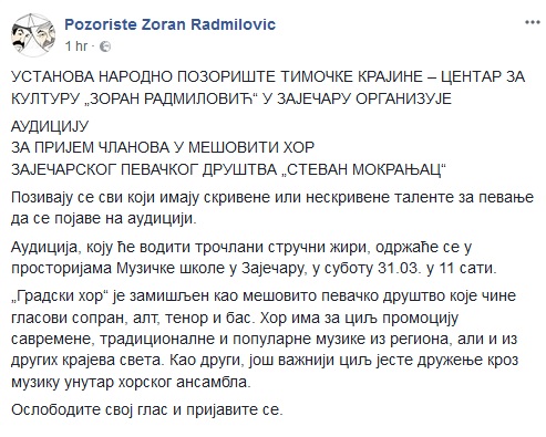 USTANOVA NARODNO POZORIŠTE TIMOČKE KRAJINE – CENTAR ZA KULTURU „ZORAN RADMILOVIĆ“ U ZAJEČARU ORGANIZUJE AUDICIJU ZA PRIJEM ČLANOVA U MEŠOVITI HOR ZAJEČARSKOG PEVAČKOG DRUŠTVA „STEVAN MOKRANJAC“