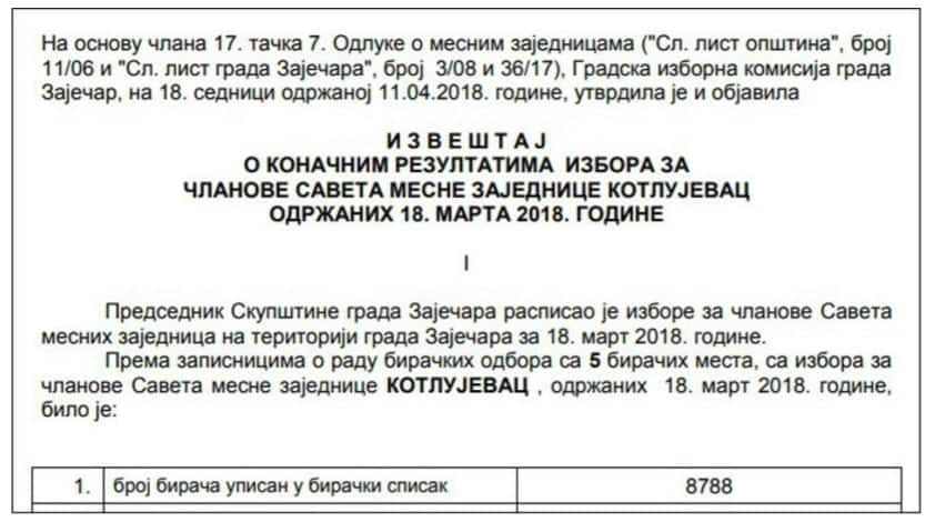 Prema podacima Gradske izborne komisije, prošle godine na izborima za članove Saveta mesne zajednice Kotlujevac pravo glasa imalo je 8788 glasača.