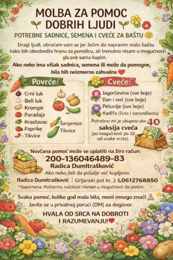 Ovim putem apelujemo na sve ljude dobre volje da, u skladu sa svojim mogućnostima, pomognu ovoj porodici – bilo donacijom hrane, sredstava za sadnju ili drugim vidom podrške.