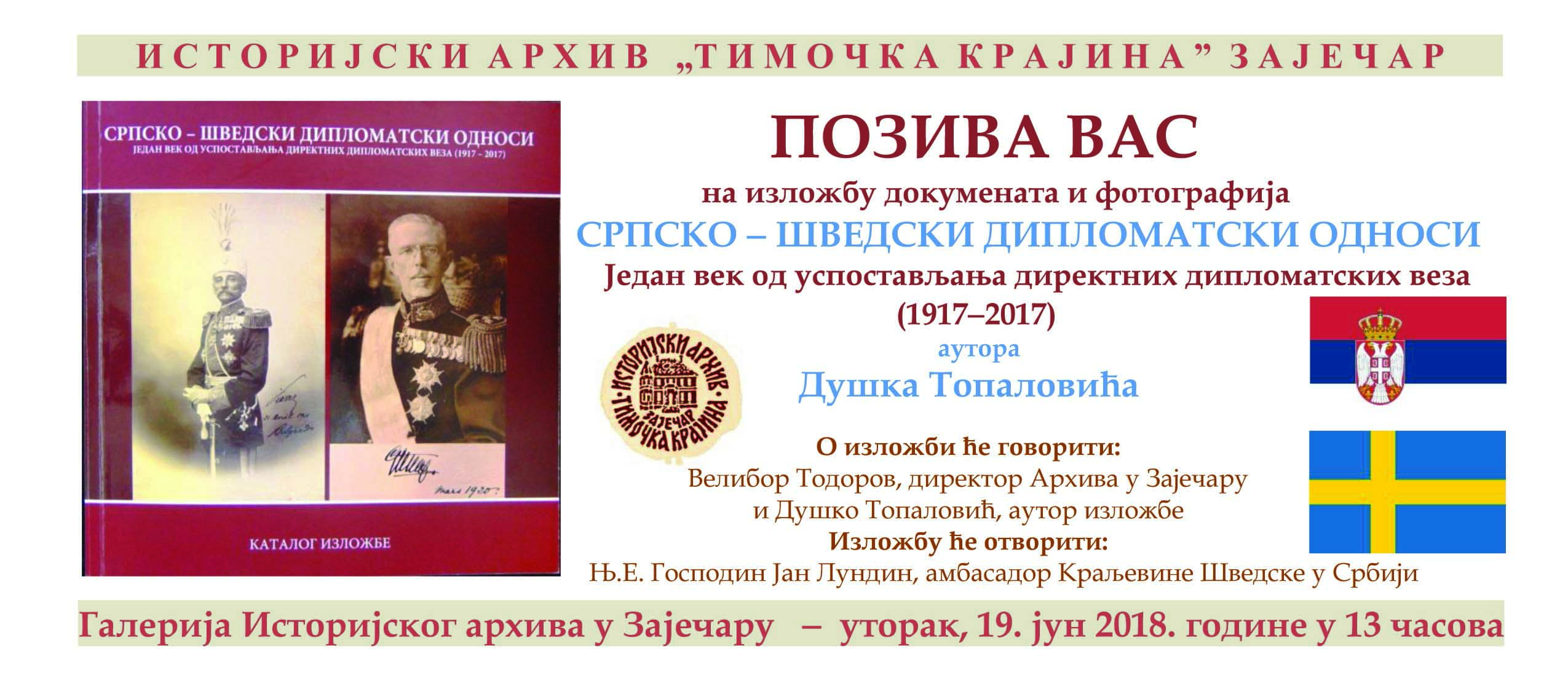 U utorak 19. juna u Istorijskom arhivu „Timočka krajina“ u Zaječaru biće priređena izložba dokumenata i fotografija pod nazivom: „Srpsko – švedski odnosi od 1917-2017. godine“.
