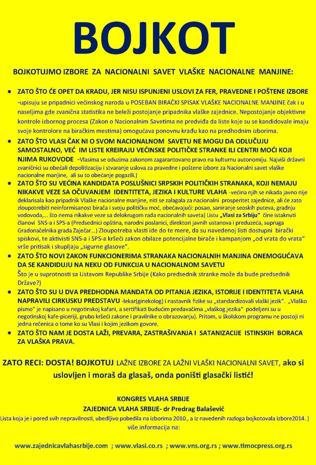 Zato još jednom pozivam sve na bojkot lažnih i sramnih izbora kojima se nastavlja dalje ponižavanje nas Vlaha.“