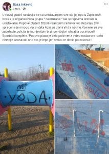 „U novoj godini nastavlja se sa unistavanjem sve sto je lepo u Zajecaru!! Nocas je organizovana grupa “ naoruzana “ lak sprejevima krenula u unistavanju Popove plaze!! Brzom reakcijom radnika koji dezuraju 24h sprecena je mnogo veca steta koju su planirali da nacine.Kamere su sve zabelezile,policija je munjevitom brzinom stigla i uhvatila pocinioce!!“ napisao je Ivković koji je i objavio fotografije.