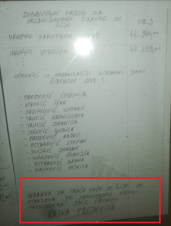„Rekao sam Brani da ne prikuplja priloge od meštana, jer smo već imali problema zbog toga, imali smo ranije inspekciju, i ljudi koji su vršili kontrolu upozorili su nas da to ne smemo da radimo. Prošli put su nam, iako je bilo nepravilnosti, progledali kroz prste i jasno nam rekli da to više ne radimo. Mi smo opštinska ustanova i ne smemo da idemo i da sakupljamo novac, to može raditi treće lice, neko ko nema veze sa savetom, mi ne. Ona je insistirala, i uradila je to na svoju ruku, bez moje saglasnosti. Išla je i sakupljala je priloge od meštana.“ – kaže Rajko Predović predsednik Saveta Mesne zajednice Šipikovo