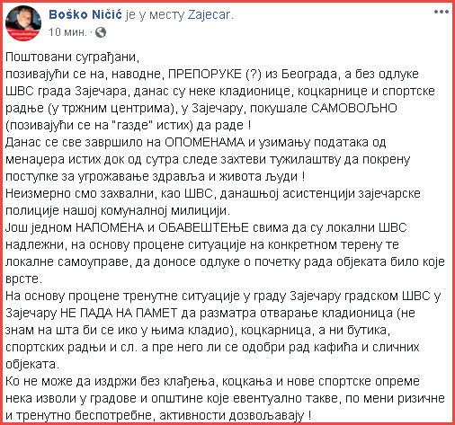 „Poštovani sugrađani, pozivajući se na, navodne, PREPORUKE (?) iz Beograda, a bez odluke ŠVS grada Zaječara, danas su neke kladionice, kockarnice i sportske radnje (u tržnim centrima), u Zaječaru, pokušale SAMOVOLjNO (pozivajući se na “gazde” istih) da rade“.– istakao je Ničić.