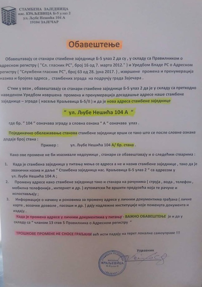 Najvažnije za meštane ovog naselja Zaječara je da znaju da u skladu sa Pravilnikom o adresnom registru troškove zamene dokumenata ( ličnih karti, putnih isprava… ) neće snositi građani, već lokalna samouprava.