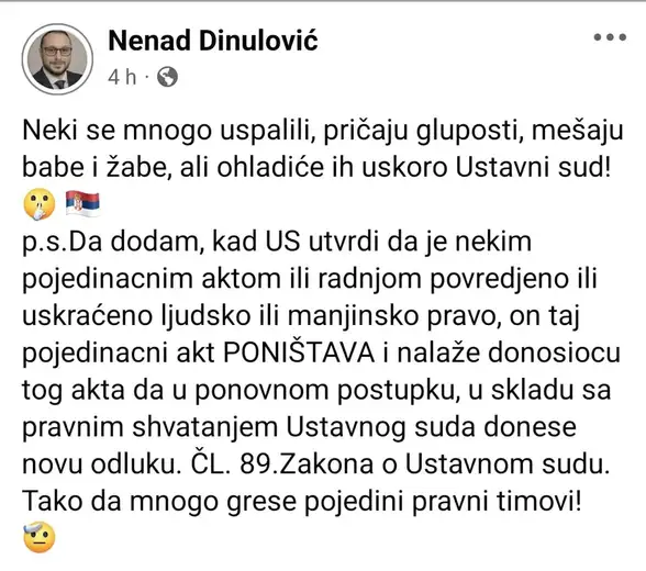 "Neki se mnogo uspalili, pričaju gluposti, mešaju babe i žabe, ali ohladiće ih uskoro Ustavni sud", poručio je na svom Fejsbuk profilu, Nenad Dinulović, predsednik GIK-a i direktor Centra za socijalni rad.