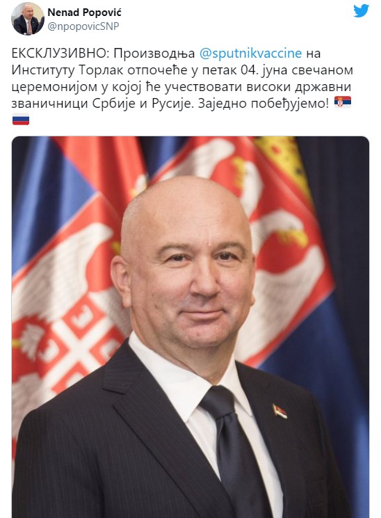 Proizvodnja ruskih „Sputnjik V“ vakcina protiv korona virusa počinje na Torlaku u petak 4. juna, objavio je na Tviteru ministar Nenad Popović.