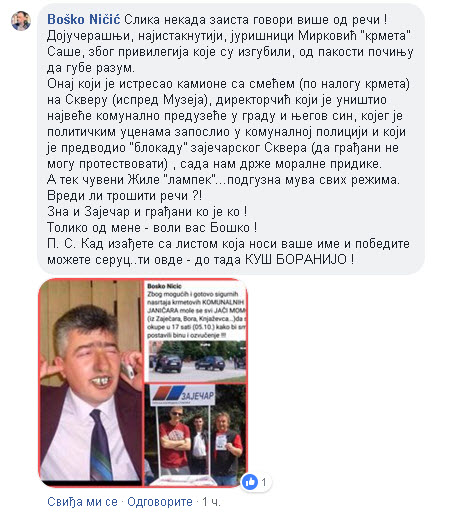 Nekadašnji prijatelji, gradonačelnik Zaječara Boško Ničić i bivši direktor JKP „Higijena“, i nekadašnji šef SPO-a, Goran Đorđević, kao i sin pomenutog Đorđevića, ukrstili su koplja danas na Facebook zidu nekadašnjeg saradnika Boška Ničića, Nelija Nikolića.