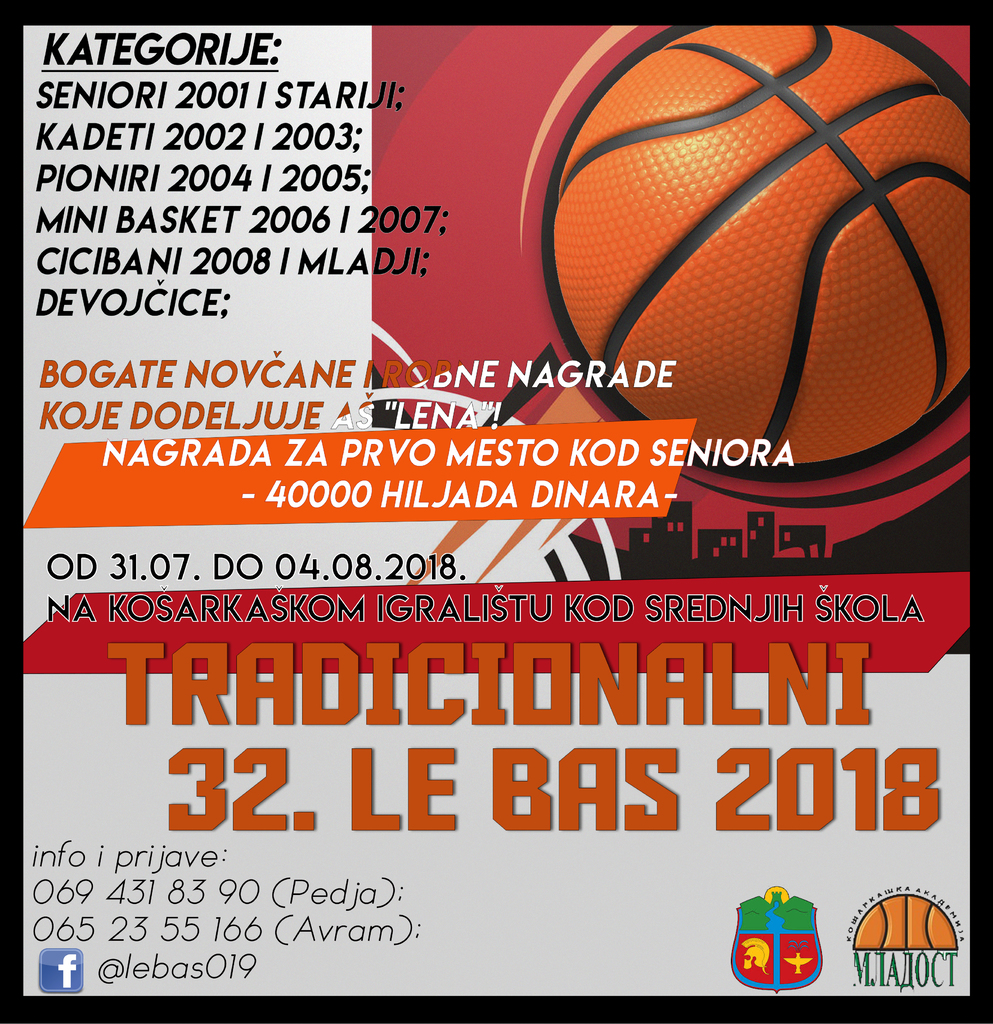 U Zaječaru će se od 31.7.do 4.8.2018.godine održati tradicionalni 32. basket turnir „LE BAS“ 2018, turnir se održava na košarkakom terenu kod srednjih škola.