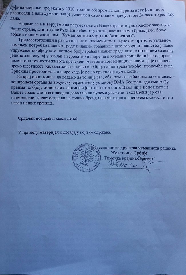 Društvo humanista radnika Železnice Srbije „Timočka krajina – Zaječar“ veoma je dobro organizovano kada je u pitanju uključivanje dobrovoljnih davalaca krvi u pitanju, a jedinu poteškoću ovoga puta predstavljala su sredstva za potrebna za organizovanje tradicionalnog ručka za davaoce. Na zahtev za pozajmicom Grad Zaječar nije odgovorio.
