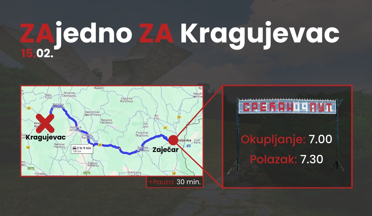 Neformalna grupa studenata i mladih iz Zaječara „Zaječarci u blokadi“, poziva građane da se pridružite organizovanom polasku za Kragujevac iz Zaječara, 15. februara u 7.30 časova.
