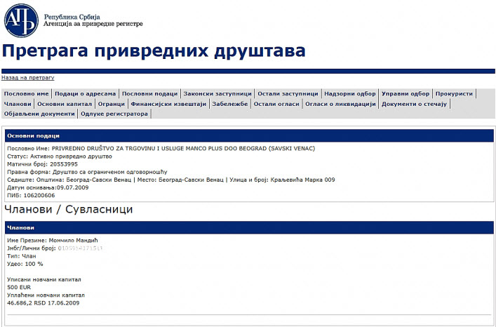 Radi se dakle o firmi osnovanoj 2009. godine, za koju je sadašnji zakonski zastupnik Vladimir Mandić 23. 01. 2017.god. podneo zahtev APR-u najpre za promenom zakonskog zastupnika, a zatim 25. 10. 2017. i za brisanjem zakonskog zastupnika sa kojim je do tada zajedno zastupao firmu .